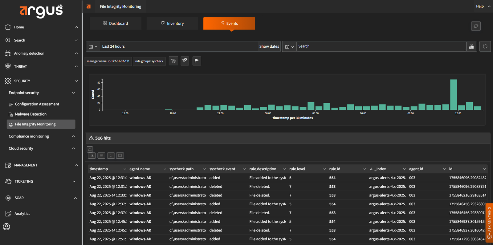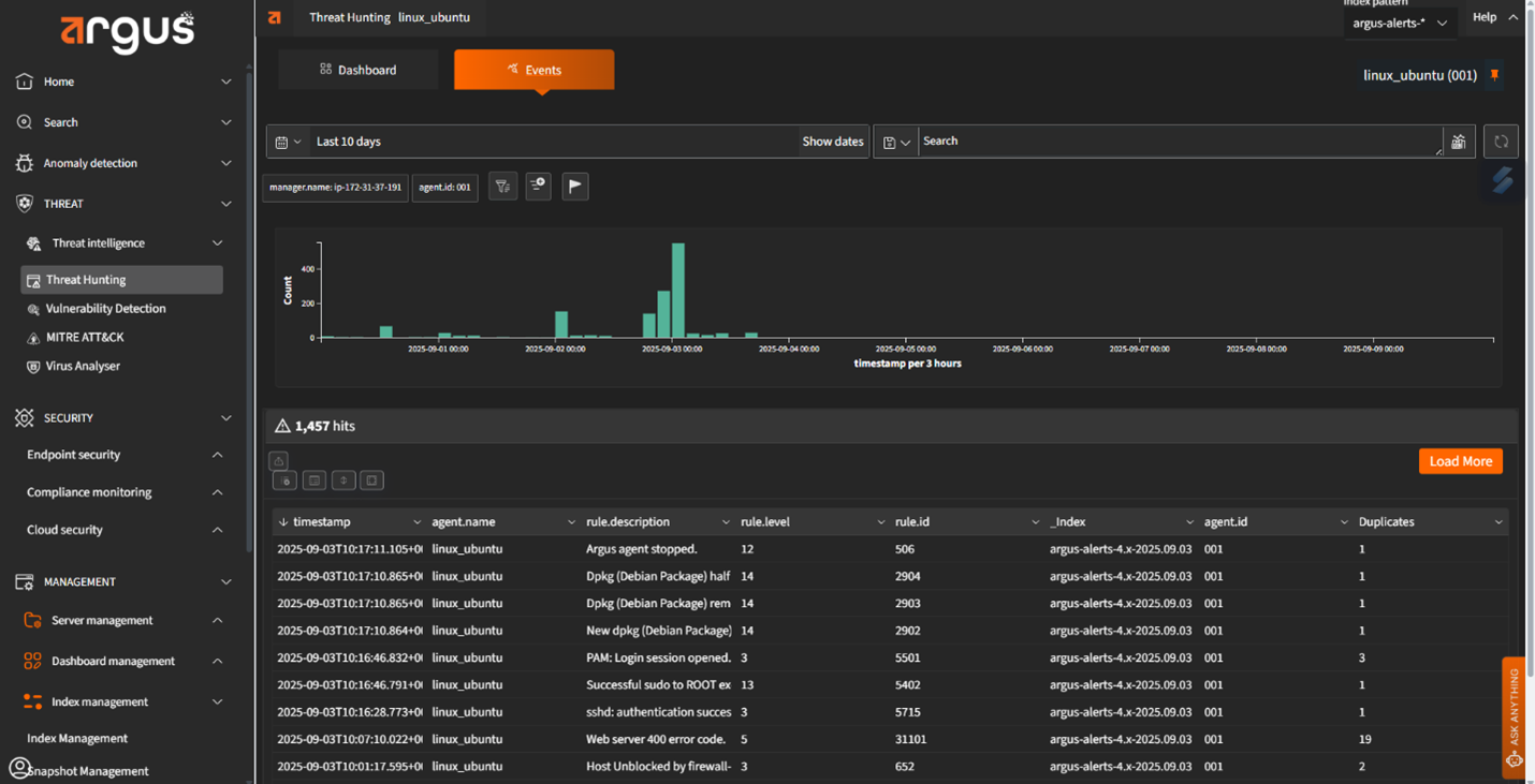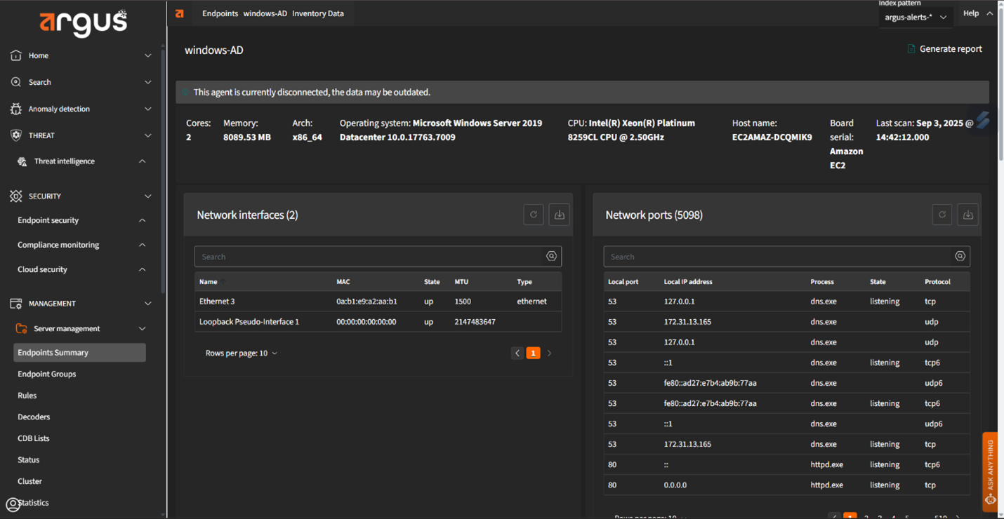Argus provides real-time visibility into every endpoint. It uses tools like OSQuery and Sysmon to uncover hidden anomalies, enabling immediate investigation and response. This level of visibility helps reduce the dwell time of advanced threats and supports detailed forensic analysis.
