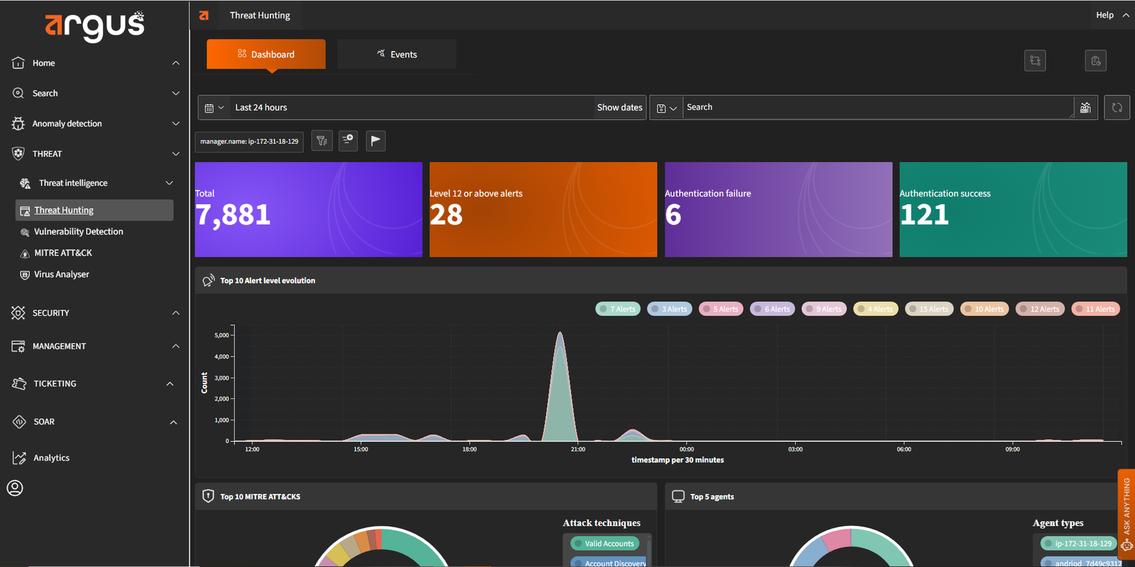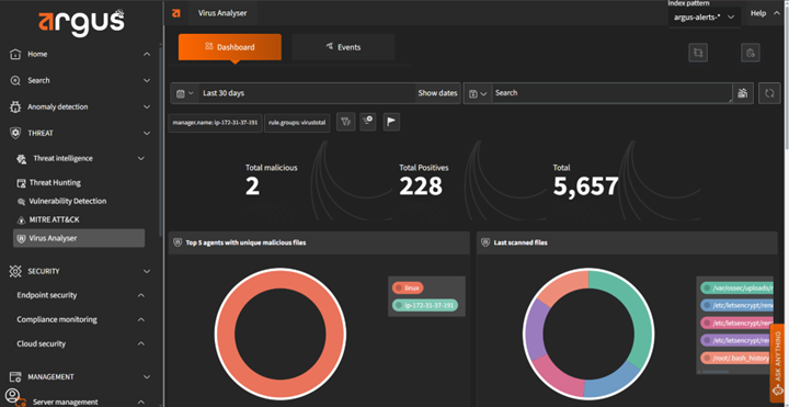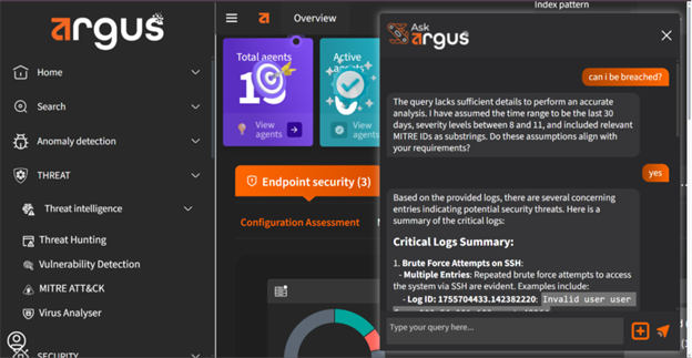 Argus includes a built-in AI assistant that helps security teams interpret alerts and suggest next steps. It identifies the root cause of events, links them to known attack patterns, and provides actionable guidance so your team can move from detection to containment quickly.